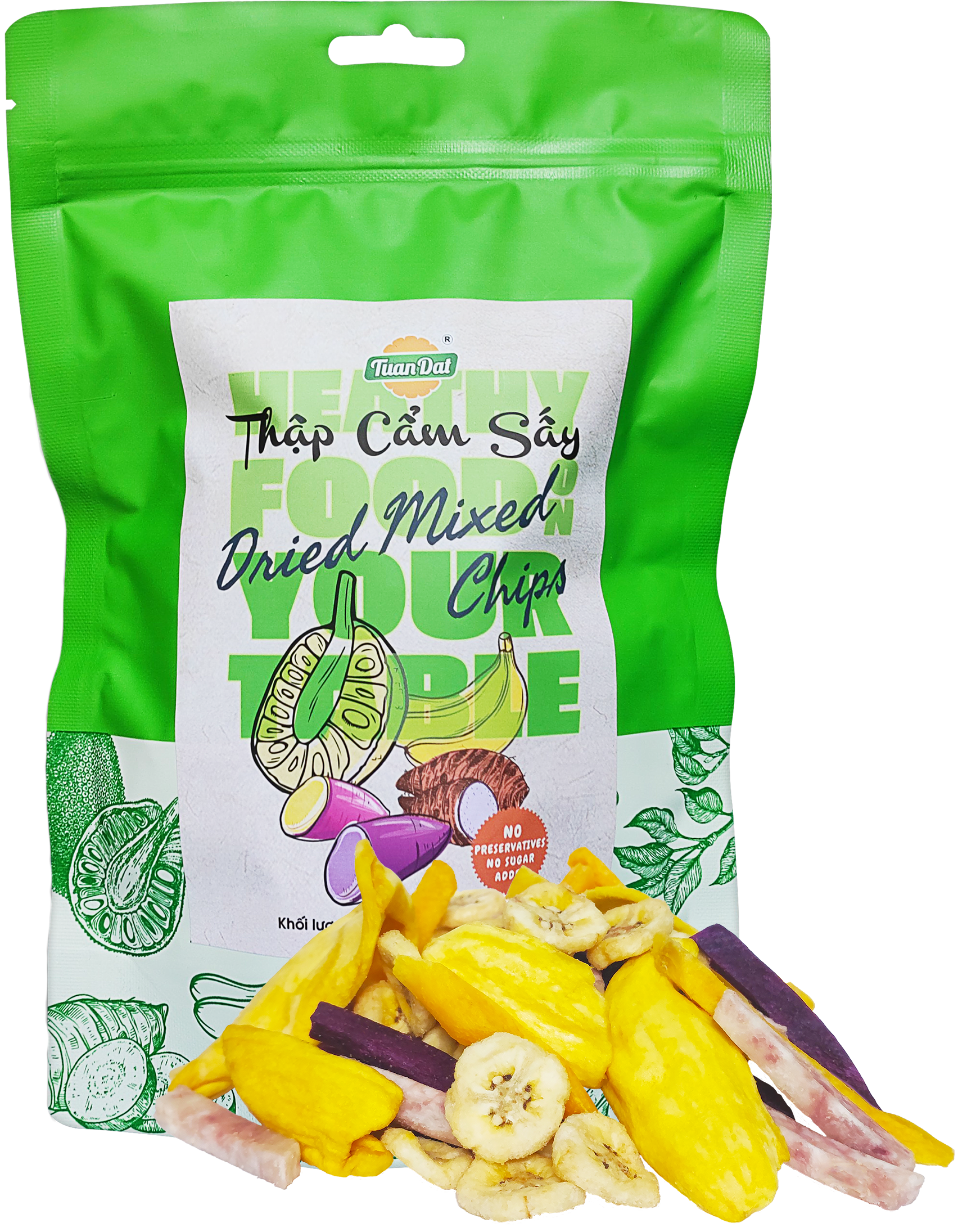 (IT) Chips Miste di Frutta e Verdura Essiccata. Conservare in un posto fresco, evitare la luce diretta del sole. Dopo rapertura da conservare nel frigorifero e da consumare entro 10 giorni. Ingredienti: Banana 30%, patata dolce viola 26%, patata dolce gialla 19%, jackfruit 13%, taro 10%, olio di palma. Da consumarsi preferibilmente entro il: Vedere la parte anteriore della confezione. Origine: Vietnam.