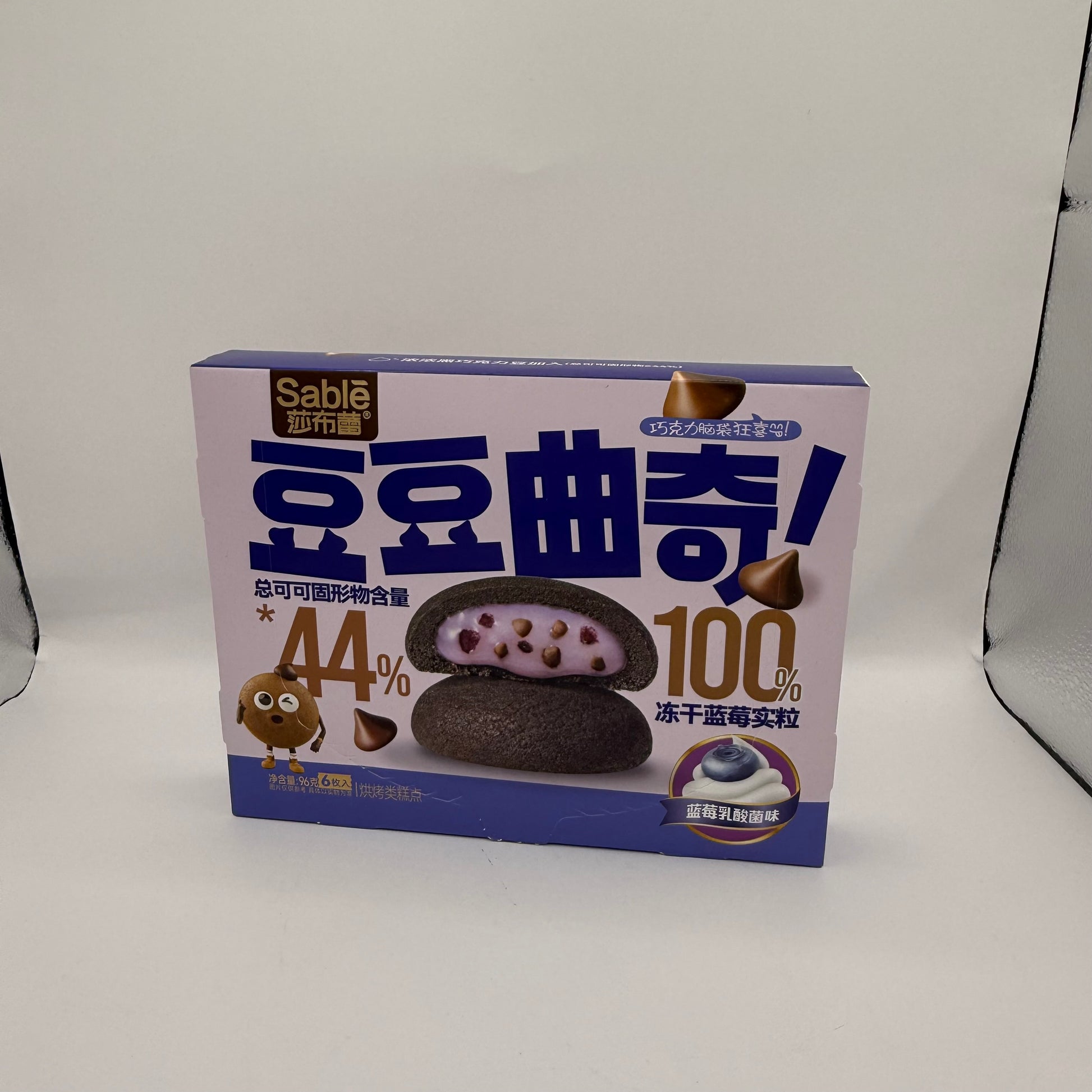 (0.93%), tuorio d'uovo liquido (0.7%), mirtilli congelati liofilizzati a pezzetti, sale, colorante (E170), emulsionante (E450i), regolatore di acidità (ES00ii), addensante(E341i), amido commestibile. Ingredienti di ripieno: olio di palma, sciroppo di malto, zucchero, acqua, emulsionanti (E420, E1450, E473), regolatori di acidità (E330,E296),addensanti,(E460i,E407),amido di mais,commestibile , stabilizzante (E1442),aromi.